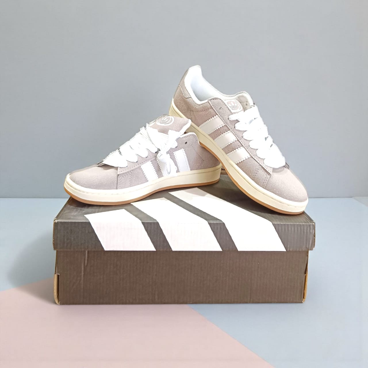 The sneakers you’re holding are the Adidas Campus 00s in a grey and white colorway. This model is an updated version of the classic Campus 80s, reimagined with a chunkier, Y2K-inspired skate aesthetic that is currently very trendy.
