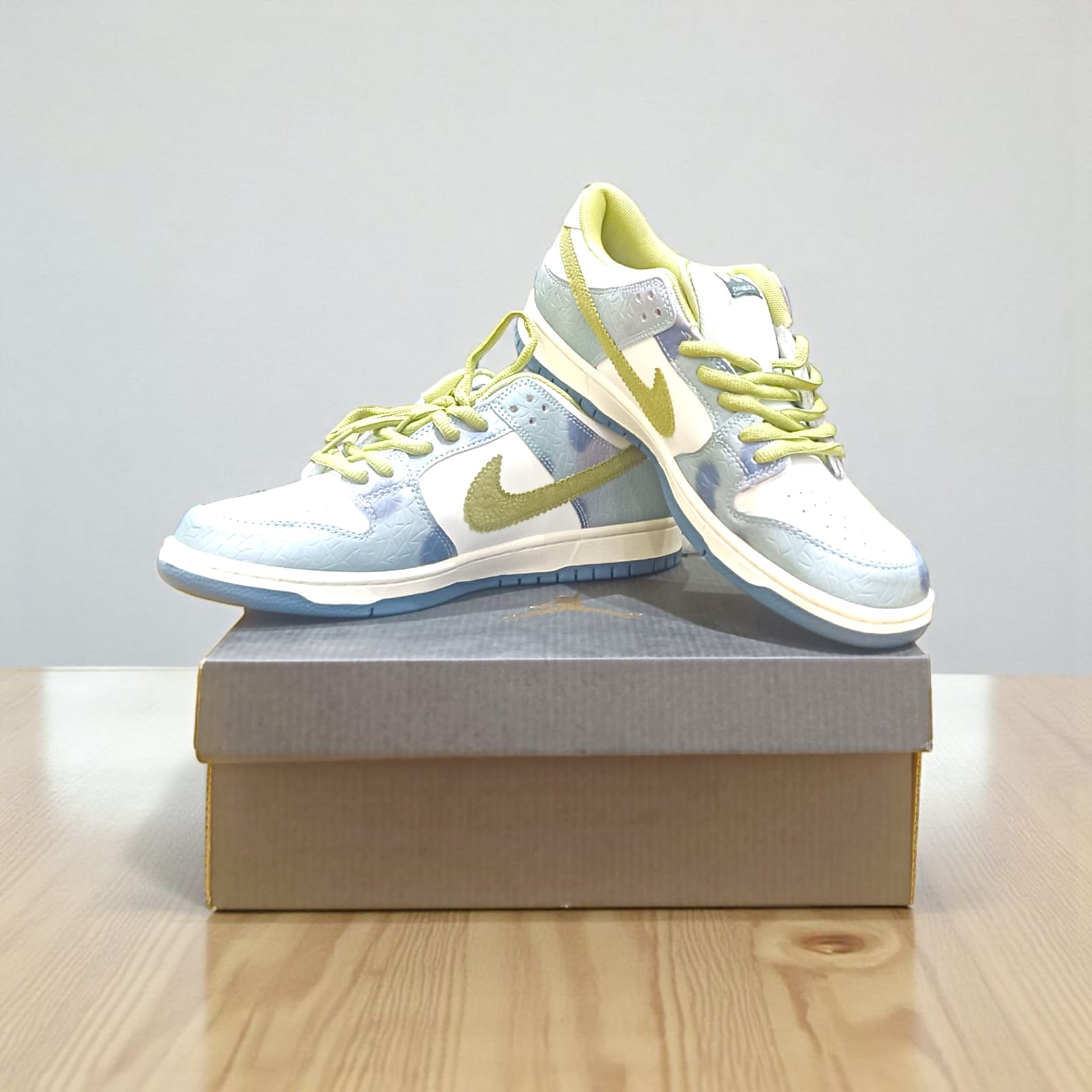 The shoe in the image is the Nike SB Dunk Low Pro ‘Chameleon’ x Alexis Sablone. This sneaker is a collaboration with professional skateboarder and artist Alexis Sablone and features several notable design elements.