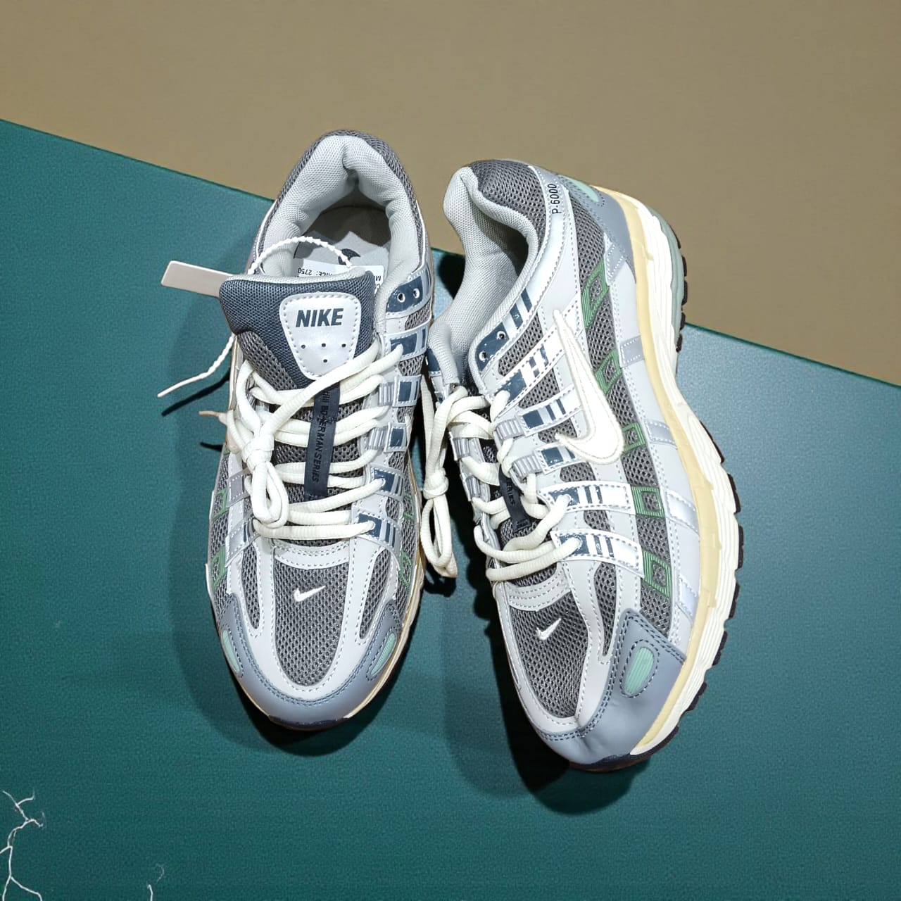 The shoe in the image is the Nike P-6000 in a “Smoke Grey” colorway. The tag information indicates a size 43 and the MRP (Maximum Retail Price) of 2750.